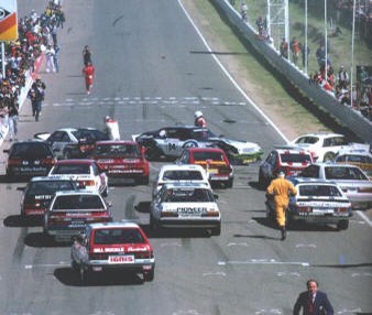 Above: You can see the car just this side of the Camaro and next to the Bond Network Alfa car, after the 1984 start line pile up. Note also the Nelson Mustang on the left.
